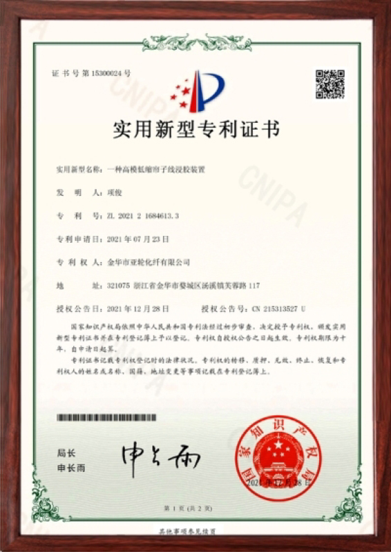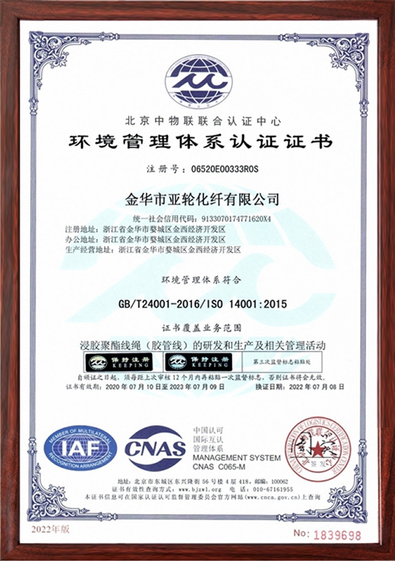 金华市亚轮化纤有限公司成立于1997年。是一家集科研、设计、生产的橡胶骨架材料专业厂家,是产品国家标准的制定者。公司坚持以“创新实现价值,专业造就品牌”的理念,主要产品有用于高、低压橡胶管、汽车刹车管、汽车空调管的涤纶浸胶管线、涤纶定型线、轮胎用尼龙和芳纶单根帘线。目前本厂产品已覆盖全国省市并远销欧美、东南亚等,深受广大用户的青睐和信赖。